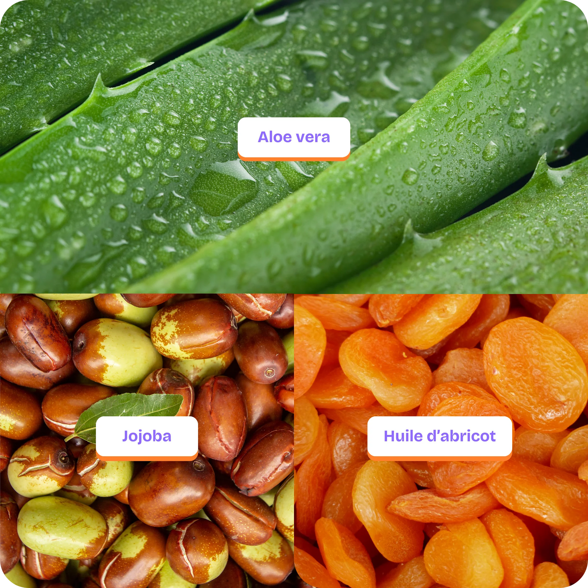 Du gel d'aloe vera, de l'huile de jojoba et de l'huile de noyaux d'abricot. Pour fixer, embellir, assouplir, hydrater et éviter les frisottis.