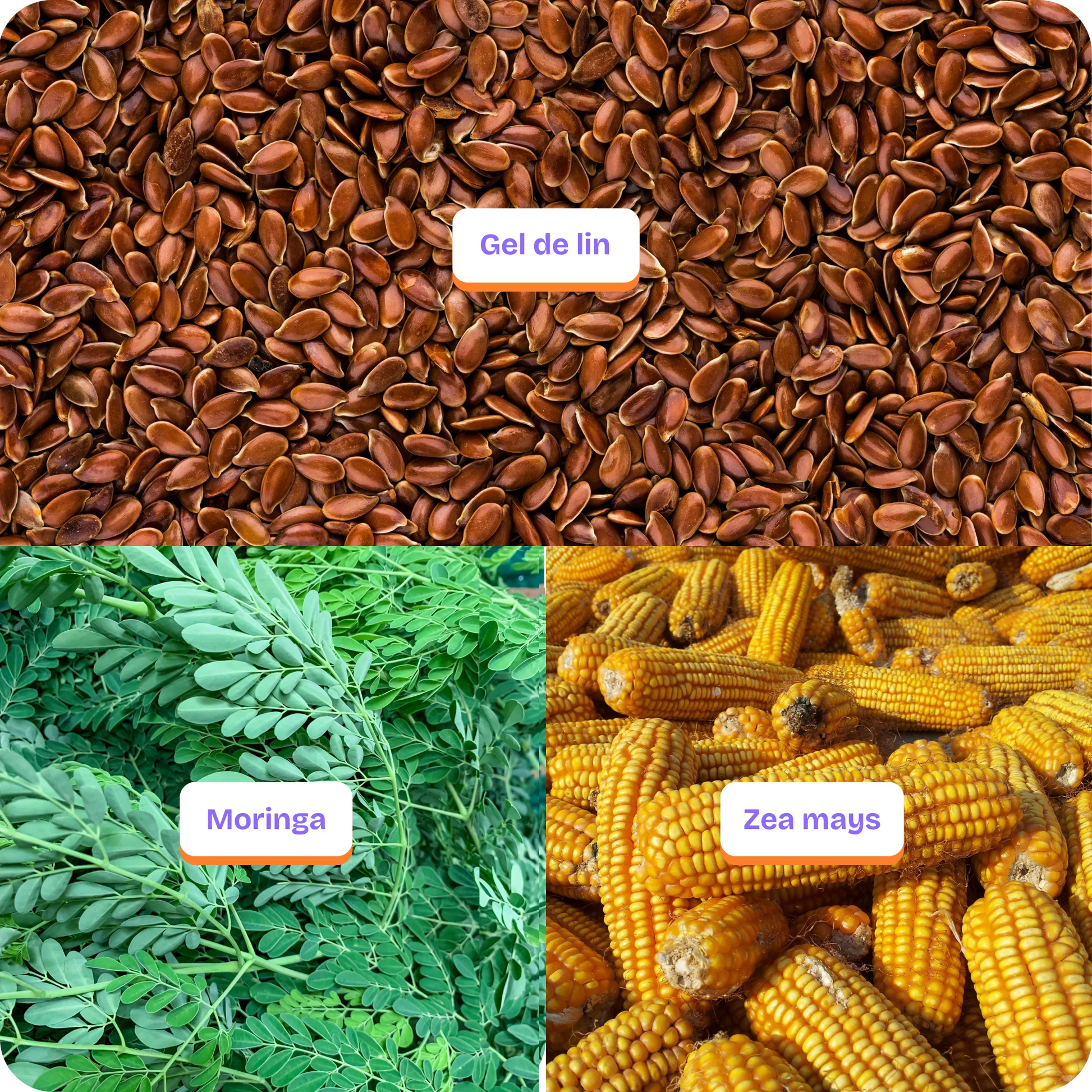 Le gel de lin, le moringa et le zea mays sont des ingrédients bénéfiques spécifiquement pour les cheveux bouclés :