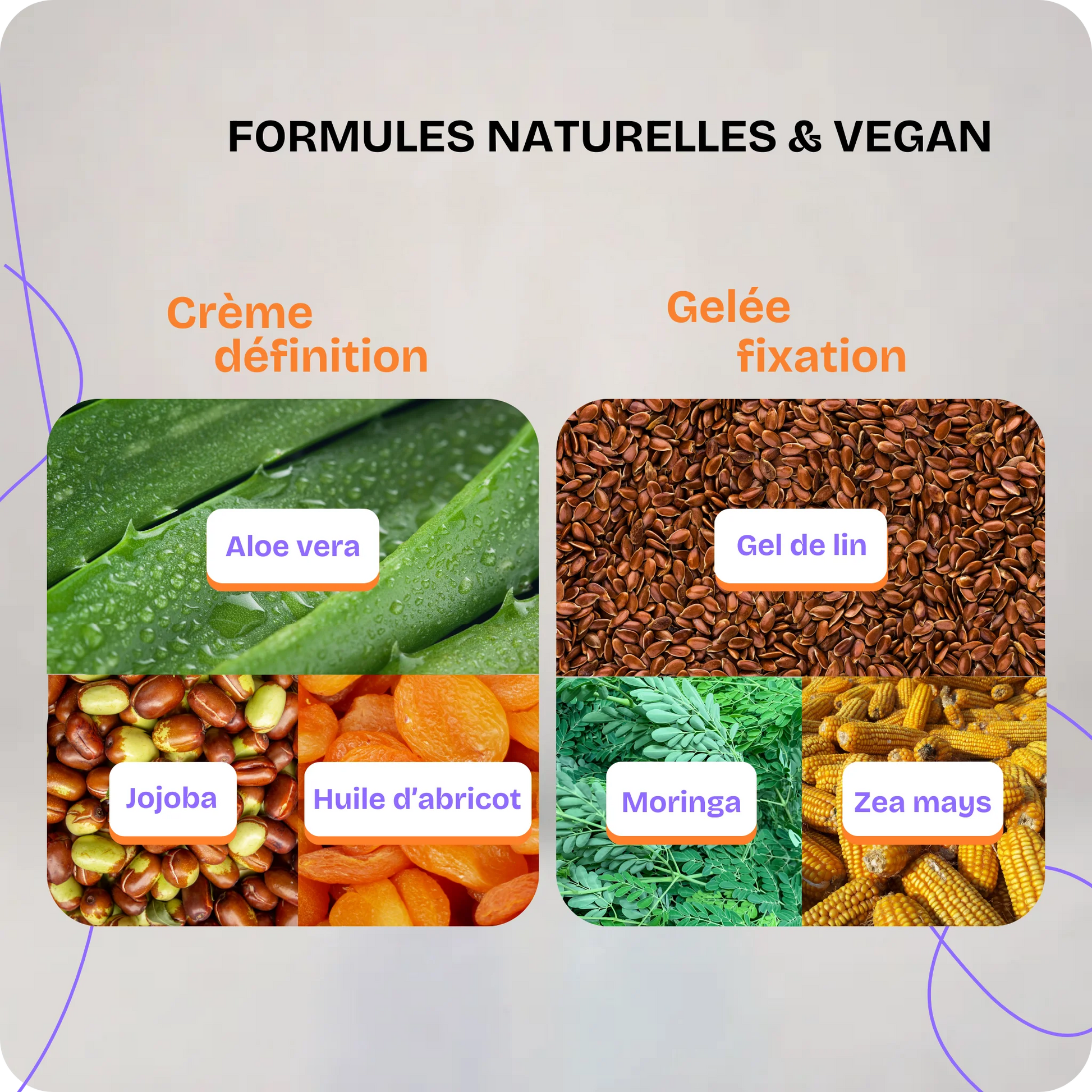 - Gel d'aloe vera : Assure une hydratation continue et une définition durable des boucles.